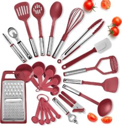 - 24 Piece Cooking Utensil Set- Includes, can opener, turner, slotted turner, spoon, slotted spoon, ladle, whisk, spatula, grater, tongs, measuring cups, measuring spoons, potato masher, ice cream scoop, wine opener, apple corer.