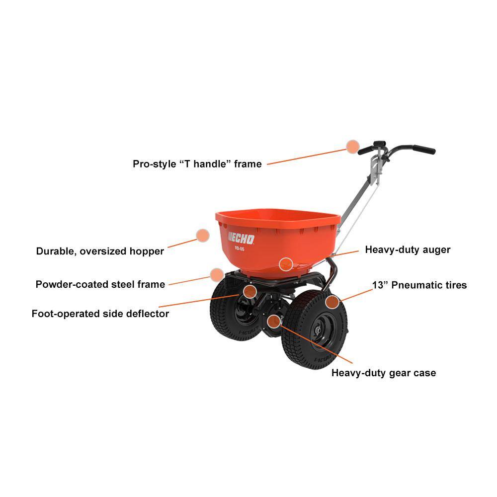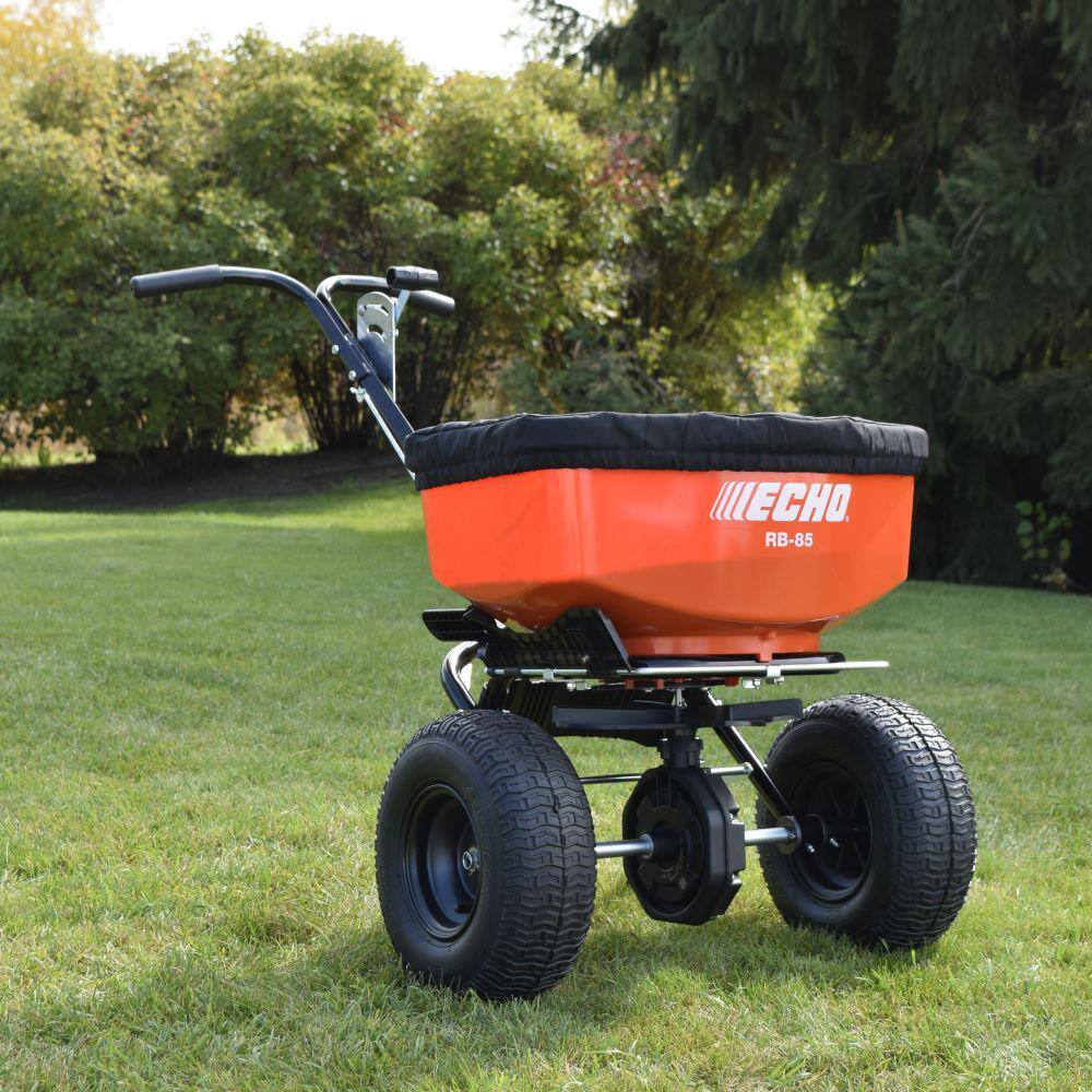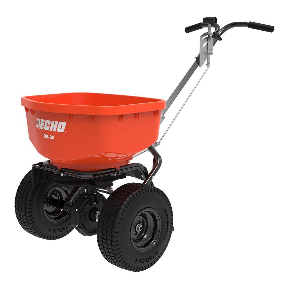 The ECHO RB-85 features 13 in. Dia tires and a tough, corrosion-resistant powder-coated steel frame to support an oversized 85 lbs. capacity hopper. A heavy-duty agitator breaks up clumps, while a foot-operated deflector shield keeps materials out of unwanted areas. With a factory-calibrated spread pattern, the RB-85 assures even, accurate coverage. This professional Spreader holds up to 1.5 cu. ft. of material and includes a hopper grate and cover.