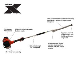 ECHO’s X Series SHC-2620S shafted hedge trimmer puts power and performance in a mid-length shafted hedge trimmer. Razor Edge blades have 3 sharpened sides per cutting tooth for greater cutting performance. The offset design allows space between you and your cutting surface.