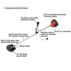 - Brush cutter features a 42.7 cc professional-grade 2-stroke engine