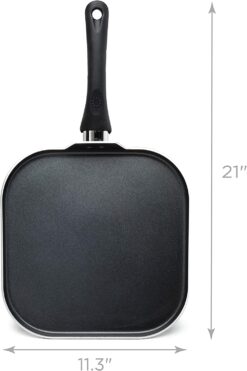 - EXCEEDS EXPECTATIONS: This multipurpose griddle pan is built to perform and last. Extra durable construction offers even heat distribution. Riveted stay cool silicone handle provides a safe, confident and comfortable grip.
