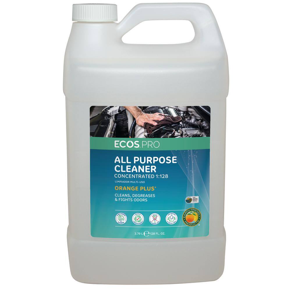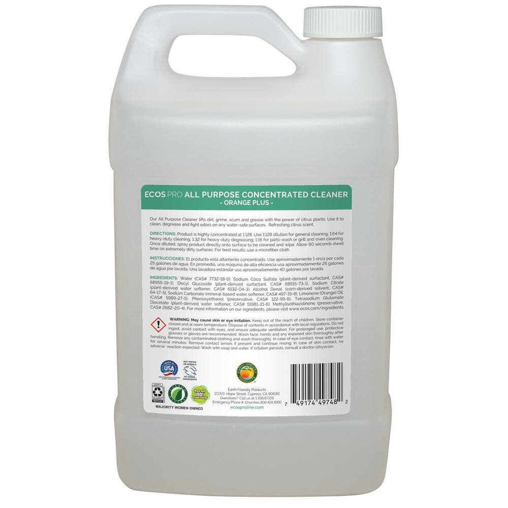 ECOS Pro Orange Plus 1:128 Concentrate All Purpose Cleaner, Degreaser, 1 Gal., Cleans and deodorizes with the natural power of oranges. Effectively removes dirt, grime, scum, adhesive residue and grease from any water-safe surface. Readily biodegradable, pH balanced formula is made using sustainable, plant-derived surfactants. Product is free of dyes, greywater and septic safe. Recognized by the USDAs BioPreferred Program. Use 1:128 dilution for general cleaning. Use 1:64 dilution for heavy-duty cleaning and general degreasing. Use 1:32 dilution for heavy-duty degreasing. Use 1:16 dilution to use as a parts-wash or grill and oven cleaner.