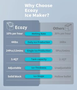 - [Solid & Slow-melting Ice] The Ecozy ice make creates clear and solid ice cubes, which are different from hollow bullet-shaped ice. The ice is crystal clear with no air bubbles, and it melts slowly, preserving the flavor of your drink for a longer time. Enjoy your beverage to the fullest with this incredible machine!