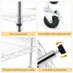 - STRONG WEIGHT CAPACITY: The total max weight with leveling feet is 2500-lbs, 1350-lbs with wheels, and 900-lbs with wheels in motion – Each shelf holds up to 350-lbs with leveling feet, 270-lbs with wheels when not in motion, and 180-lbs with wheels in motion with evenly distributed weight