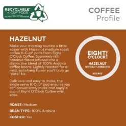 Make your morning routine a little easier with the Hazelnut Medium Roast Coffee K-Cup pods from Eight O’Clock. Supremely rich hazelnut flavor infused into a distinctive blend of 100% Arabica coffee beans. Lightly roasted for a mild, satisfying flavor you’ll truly go “nuts” for. Delicious and easy to make, the single-serve K-Cup pod ensures you can conveniently make and enjoy a cup of Eight O’Clock coffee with ease.