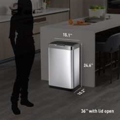 - Sleek and Durable Finish – Meticulously crafted with a stainless steel finish, this stylish touchless trash can offers a cool and smooth texture that’s durable and visually appealing for any home decor style.