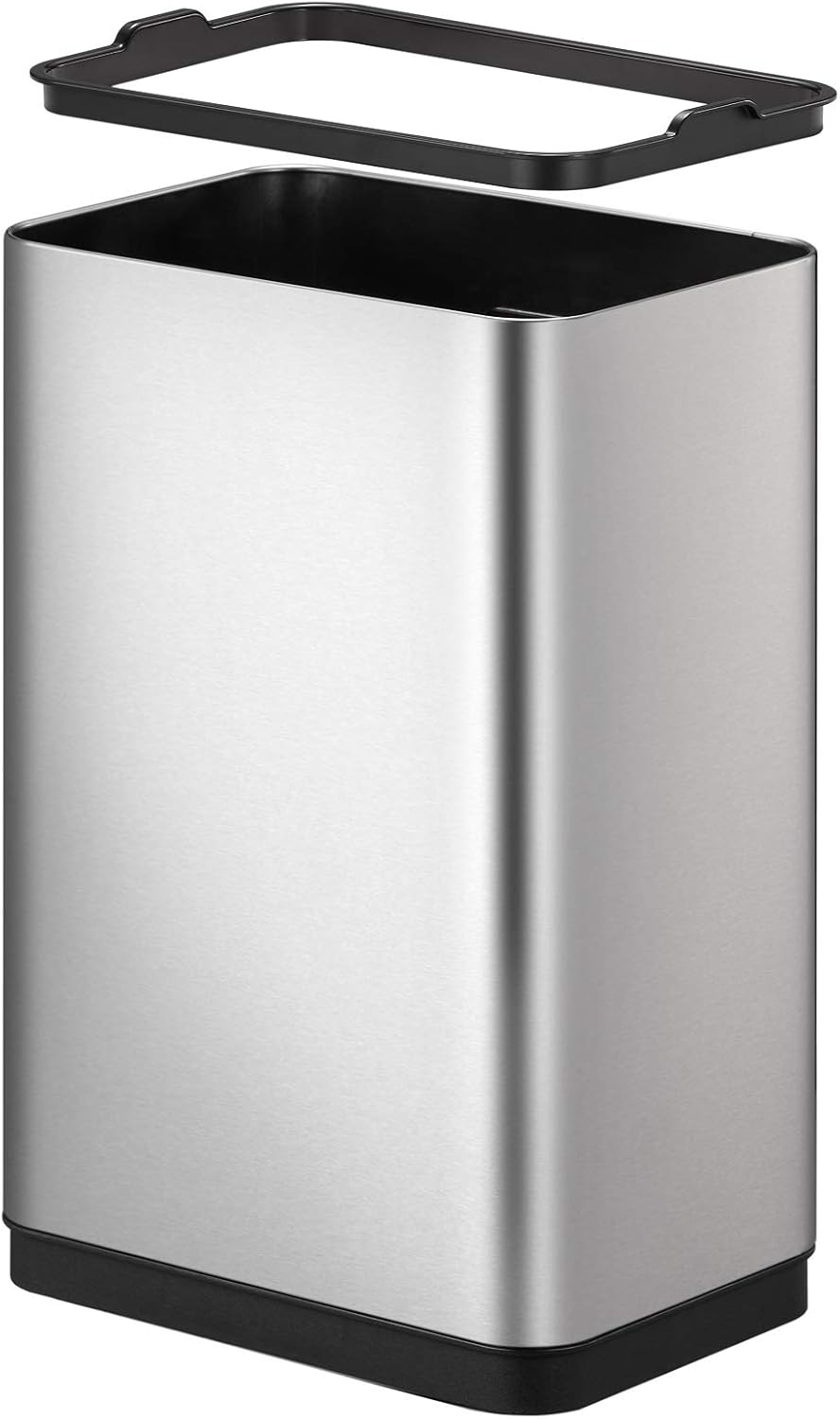 Our stylish Mirage-T Motion Sensor trash can has a fingerprint resistant coating over brushed stainless steel and offers sanitary, touchless trash disposal for your home. Offering the convenience of hands-free operation, the Mirage T sits flush against a wall or cabinet. The intelligent sensor opens only when you want it to. With the soft close feature, the lid descends gently and quietly. A simple touch switch will hold the lid open for longer when required. This no-liner sensor can allows greater trash volume (a full 13. 2G), but with smaller external dimensions – taking up less room but doing the same amount of work! The Mirage T has an easy-to-remove inner rim that holds your trash bag in place, facilitates changing, and helps keep the bag out of sight. 50L (13. 2 Gallon) capacity. Uses standard 13-gallon kitchen trash bags, no designer trash bags needed. EKO extra-strong kitchen trash bags are available – look for EKO model # EK33706B. Requires AA alkaline batteries, not included. Do not use rechargeable batteries. US-based customer service support team. Dimensions: 15.1″W x 10.2″D x 24.6″H. Height with lid open: 36″