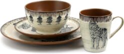 Elama Round Stoneware Cabin Dinnerware Dish Set, 16 Piece, Wolf Design with Warm Taupe and Brown Accents