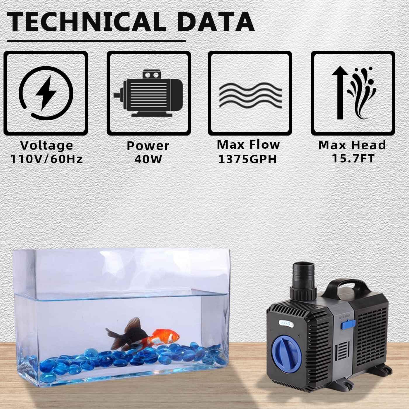 - 115V/60Hz;Power 40W; Max flow 1375GPH(Adjustable);Max lift 15.7FT