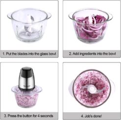 - USER-FRIENDLY DESIGN: other than meat grinder, it only takes seconds to clean glass bowl and blades; non-slip rubber ring for stable operation; 2 easy and comfortable grips; lower noise-less than 40db.