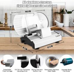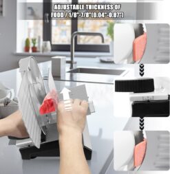 - [Durable and safe]The meat slicer is made of high quality die-cast aluminum, 4 pieces of silicone non-slip suction cups to tighten the machine, and a durable metal body fits most cabinets and countertops. Perfect for flat. Day lunch prep or making gourmet meals, Get a 30-day money back policy and 18-month extended warranty by signing up.