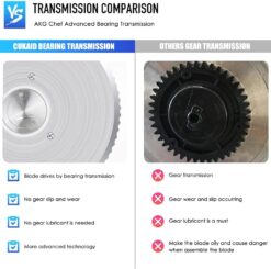 - [Advanced Technology] We adopted the most advanced and patented bearing plus belt transmission structure for blade working, and NO meat slicer lubricant is needed for operating this slice machine. Compared to gear drive, which is easy for the wheel to slip and the gear to wear, and lubricant is required and leaking sometimes (makes your hand oily when installing/unloading the blade), ours is more reliable, durable, easier to maintain and operate.