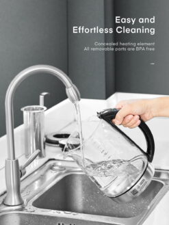 - Easy to Clean: The removable top means I don’t have to stuff my hand inside the pot to clean it – it’s easy to access. Clean all of the tea stains and some of the mineral deposits off after using this glass kettle electric by using some baking soda and a washcloth. Keep doing this once a week. It looks new again!