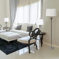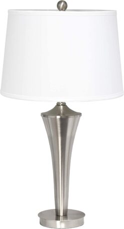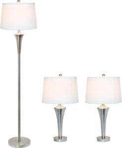 Redecorating or moving into a new space can be wonderful when you choose pieces that transform a basic room into a page right out of your interior design magazine. The Elegant Designs Tapered 3-Pack Lamp Set with White Shades will do just that. It includes two table lamps and a floor lamp curving down and inwards towards the base, coated in a sleek and modern brushed nickel finish. The tapered white hardback fabric shade allows just the right amount of light to shine through and brighten up your room, as each lamp requires a 100 Watt bulb which is not included. Each table lamp is powered by a clear plug-in cord, measuring 6.5 feet for the table lamps, 9.5 feet for the floor lamp, and complete with an accessible rotary switch on the socket of each lamp.
