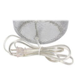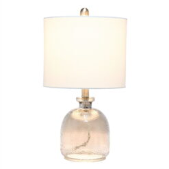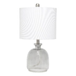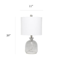 If you are looking to add a little modern flair to your home, this textured smokey gray glass table lamp with a white fabric shade is just what you need. This lovely table lamp is crafted with a textured glass base and open bottom, matched with a white fabric drum shade. This table lamp is the perfect accent piece that will blend all of your contemporary decor to your pictureque vision. Material Breakdown: 48%, Fabric, 48%, glass, 3%, metal, 1% plastic, Lamp measures D: 11″ x 20″, Shade Bottom Opening: 11.
