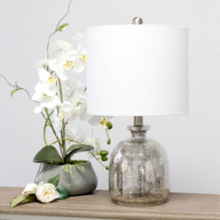 If you are looking to add a little modern flair to your home, this textured mercury glass table lamp with a white fabric shade is just what you need. This lovely table lamp is crafted with a textured glass base and open bottom, matched with a white fabric drum shade. This table lamp is the perfect accent piece that will blend all of your contemporary decor to your pictureque vision. Mercury dome glass base. White fabric drum shade. Easily accessible rotary switch located on the socket. Uses 1 x 60W medium type A base bulb (not included). Available in additional base and/or shade color options. Lamp measures D: 11″ x 20″. Material Breakdown: 48% Fabric, 48% glass, 3% metal, 1% plastic. Cerification: UL/cUL Listed.