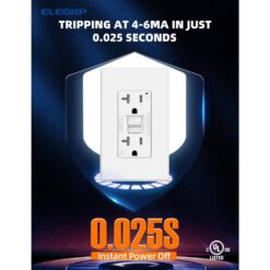 ELEGRP’s ground fault circuit interrupter (GFCI) outlet provides continuous protection from ground faults during its whole life period. The GFCI receptacles conduct an auto-monitor function self-test every five seconds exceeding UL 943 requirementsfor a frequency of 8 hours. Ultra-compact design leaves more space for other wiring devices for easier and quicker installation in electrical boxes. Miswire protection interrupts power in an event that the GFCI receptacle is miswired by interposing line and load branch circuit supply wiring. The GFCI receptacle will deny power to receptacle face and downstream. Automatic shutter system prevents young children from inserting unwanted objects into the outlets. Our products are UL and CUL Listed, which meets UL standards.