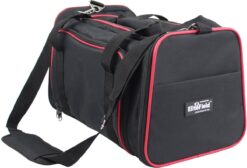- A pocket for accessory storage. Hand carrying straps and adjustable padded shoulder strap allow for many carrying options. The adjustable shoulder strap also allows the carrier to be restrained with a seat headrest for car travel. Only 3″ high after folding down the carrier for easy storage.
