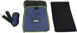 - A pocket for accessory storage. Hand carrying straps and adjustable padded shoulder strap allow for many carrying options. The adjustable shoulder strap also allows the carrier to be restrained with a seat headrest for car travel. Only 3″ high after folding down the carrier for easy storage.