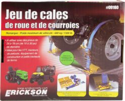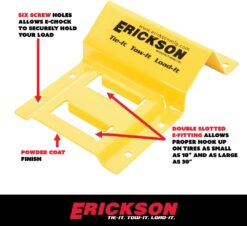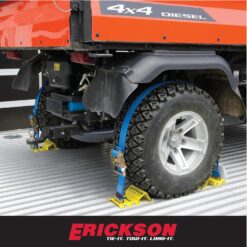 Erickson 09160 Wheel Chock Tie-Down Kit includes Two (2) E-Track Ratchet Straps and Four (4) Powder Coated E-Track Wheel Chocks. Designed for people that haul an ATV, mower or other off-road vehicle regularly. Wheel chocks are permanently mounted in place on your trailer deck or pickup bed. The brackets are intended to be placed behind both back wheels to hold the vehicle securely in place during transport. Simply drive over the brackets when loading and unloading. Rated for a vehicle with a maximum weight of 1500 lbs. (680kg). Strong webbed straps will work on tires as small as 10″ and as large as 30″ in diameter. Double slotted E-fitting allows for proper hook up on large and small tires. Mounting hardware is not included. As a leader of Tie-Down and Towing Products in North America, Erickson strives to provide the safest products available with the consumer in mind. Tie it. Tow it. Load it. Count on Erickson.