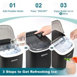 - User Friendly & Simple Operation: Euhomy ice maker adopts large see-through window visualized design, allowing viewing of the interior ice-making. Equipped with a 170w upgraded compressor that 4kWh/24H energy consumption to save your electricity bills. And with a easy-to-operate controlable panel for faster operation in just two steps, adding water and press “ON/OFF”. Then our ice maker will provide you fresh bullet ice for you and your member timely.