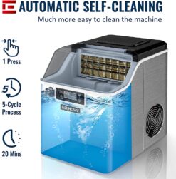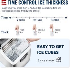 - HIGH-QUALITY ICE CUBES & Reservation- Euhomy’s countertop ice maker machine can produces 24 ice cubes per cycle (every 12 to 18 minutes). That means you can make up to 44 pounds of ice cubes every 24 hours. Best of all, you can adjust the thickness of the ice cubes according to your needs, letting you create perfect drinks. Ice Making Reservation – You can set an appointment to make ice cubes with our counter ice maker machine. Press the “TIMER” button once and set the reservation time.