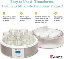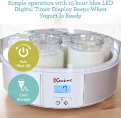 - SIMPLE OPERATION: Set it and forget it! Just heat up 42oz of milk, add our Euro Cuisine 5gr Yogurt Starter or 3-4 Tsp plain yogurt and set the timer. The blue LED Digital timer display will beep when your yogurt is ready. The machine will turn off automatically after 15 hours.