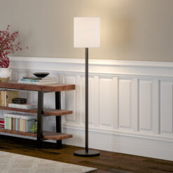 - This simple and elegant floor lamp is the perfect minimalist addition to any room in your home. Anchored by a round base, its sleek silhouette is topped with a gently elongated drum shade in crisp linen. Perfectly styled for traditional and transitional spaces, this fixture can blend in or stand out in many décor styles and color schemes.