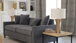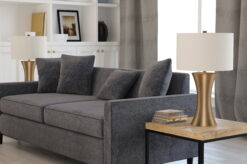 - Premium materials have been used making this lamp: linen in the shade, steel and glass in the frame and base, UL certified wiring components.The antique brass finish gives a mid-century modern style to enrich your home.