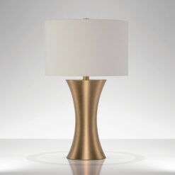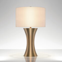 A mid-century inspired bedside table lamp handmade and finished in a sophisticated antique brass.The hourglass shape brings a modern touch to its classic and timeless design and the white chiffon linen French drum shade enchances the look with clean airy elegance. Perfect bedside table lamp in your bedroom, a contemporary living room, or home office.