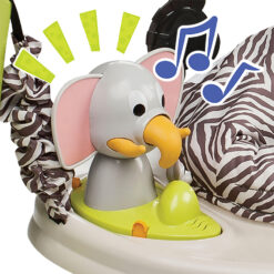 Welcome to the jungle! The ExerSaucer® Jungle Quest Jumping Activity Center will give your little one hours of developmental fun with 360-degree seat spin, 17+ activities, lights, sounds and nature-inspired colors and patterns. Jungle Quest features a unique balance base that helps build core strength and coordination. Lights and animal sounds on Ellie the elephant will entertain your baby’s jungle fever, and the ABC flip book lights up when baby turns the pages. A convenient on/off switch offers the option for quieter play as well. The soft and cuddly removable monkey can go with baby on all of his adventures. Jumping, reaching, turning and stretching are all part of your child’s development. You’ll also love that the seat cushion and removable monkey are machine-washable and the toys are easy to clean. With three height settings, the Jungle Quest jumper will be a favorite as they grow.