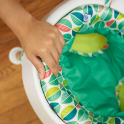 Tiny Tropics is quick to set up and transition from baby activity seat to doorway jumper and all the parts needed are included. Simply click the wood legs, with pre-assembled mat, into the tray and add the plush toucan toy to set up the baby activity seat in two easy steps. To convert to the doorway jumper, release the wood legs and click in the hanging straps. It’s that easy!