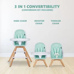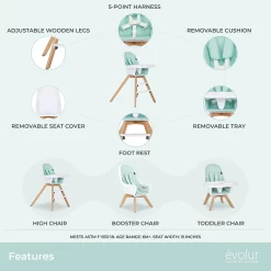 Evolur Zoodle 3-in-1 High Chair I Booster Feeding Chair I Modern Design I Toddler Chair I Removable Cushion I Adjustable Tray I Baby and Toddler, Mint