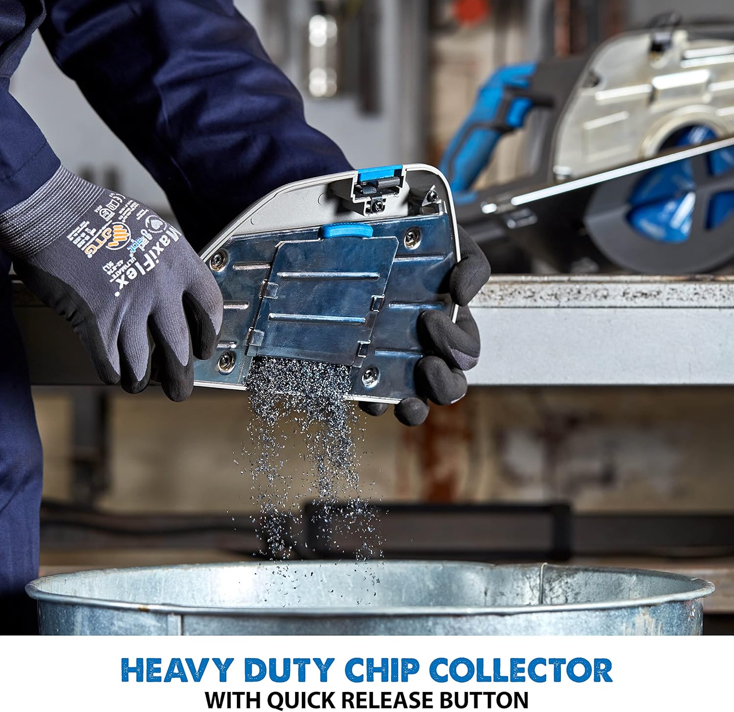 - Comes equipped with a 8-1/4 inch mild steel capable circular saw blade. Providing an instantly workable finish and produces virtually no heat, no burr, and no sparks.