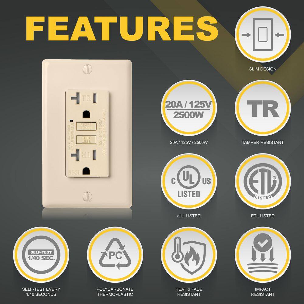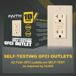 The Faith Electric GLS-20ATR-IV-10 self-testing, tamper-resistant ground fault circuit interrupter outlet provides continuous protection from ground faults, disconnecting power in 1/40 of a second if a dangerous condition is detected. Once connected to power, this GFCI receptacle automatically self-tests every 2-1/2 hours. The green indicator LED light turns off if the outlet is not receiving power, is broken or is at end-of-life. Tamper-resistant shutter safety mechanism blocks access to power unless a plug is inserted. Slimmer, modern design for easier and quicker installation in electrical boxes. Test and reset buttons match device face color to blend in seamlessly. Meets or exceeds UL943 2015 standards. Compliant with National Electric Code (NEC) requirements. ETL Listed, 10-Pack. Each pack includes (1) Ivory 20 Amp, 125-Volt GFCI duplex outlet, (1) wall plate, (2) screws, installation manual and stickers.