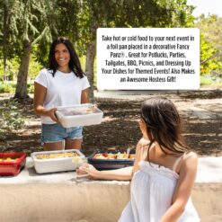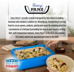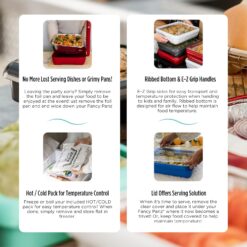 - TWO WAYS TO SERVE FROM FANCY PANZ: Remove the clear top and place under your Fancy Panz where it acts as a trivet OR leave the clear top on and lift from the tab to help maintain food temperature and keep pesky criters out! stackable and perfect for travel. No more concerns over spilling the food during transport. Ready to leave? Simply remove the foil pan from your Fancy Panz for party-goers to continue enjoying while you take your Fancy Panz home