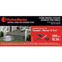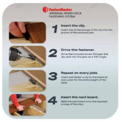 The Universal Hidden Deck Fastening System is the fastest, easiest way to hide fasteners on grooved decking. The universal hidden clip design works in most leading deck board brands. It features stainless steel components for long term performance. Compatible with nearly all grooved decking boards, such as Trex, Fiberon, Veranda and more. Made with 304 stainless steel and approved for use in saltwater applications or chemically treated lumber. Designed to fasten 200 square feet of grooved decking – includes 360 clips, 40 start/stop clips, 368 screws, and 2 T15 driver bits.