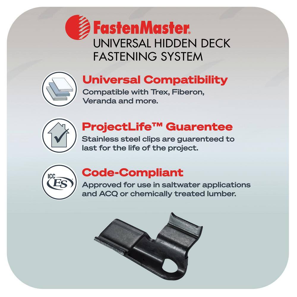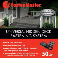 The Universal Hidden Deck Fastening System is the fastest, easiest way to hide fasteners on grooved decking. The universal hidden clip design works in most leading deck board brands. It features stainless steel components for long term performance. Compatible with nearly all grooved decking boards, such as Trex, Fiberon, Veranda and more. Made with 304 stainless steel and approved for use in saltwater applications or chemically treated lumber. Designed to fasten 50 square feet of grooved decking – includes 90 clips, 10 start/stop clips, 92 screws, and 1 T15 driver bit.