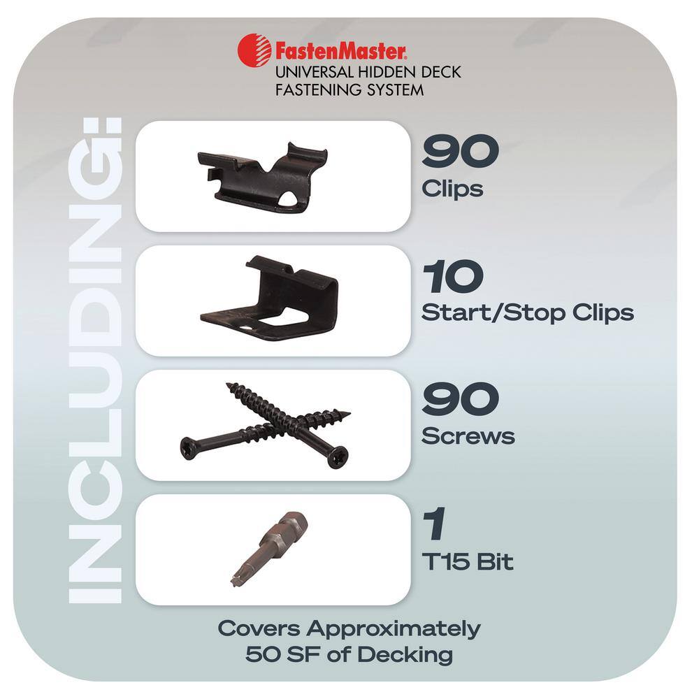 - Designed to fasten 50 square feet of grooved decking – includes 90 clips, 10 start/stop clips, 92 screws, and 1 T15 driver bit