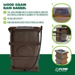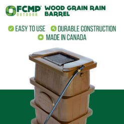 With the appearance of a traditional wooden barrel the slim-line design of the FCMP Outdoor Wood Grain Rain Barrel makes it perfect for locations where a larger barrel would be intrusive. Place them around your home to catch fresh chlorine-free water as it pours from your downspouts – Water that would otherwise make its way into storm sewers only to be wasted. Rain barrels not only save you money but lessen the strain on water resources.