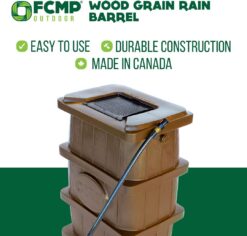 FCMP Outdoor Wood Grain 45-Gallon Rain Barrel – Water Rain Catcher Barrel with Flat Back for Watering Outdoor Plants, Gardens, and Landscapes, Grey