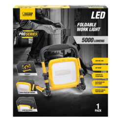 Light up the worksite with the Feit Electric WORK5000XLPLUGFOLD portable plug-in LED work light. This unit is water and dust resistant rated, with cast metal housing and a heavy-duty 18/3 power cord – no battery type or quantity is required. This light outputs 5,000 lumens of 5000K Daylight color temperature light and is rated to last 30,000 hours. The foldable design allows users to angle the light exactly where it is needed. It is ideal for use in a construction site, workshop, garage, attic, bathroom remodel, home project, or any other indoor and outdoor location. Choose a Feit Electric work light for your portable lighting needs.