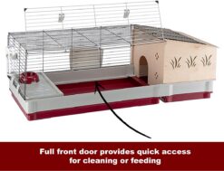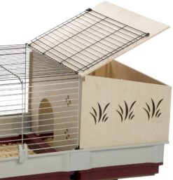 - Includes essential accessories such as a large water bottle, hay feeder, feeding bowl and elevated feeding area.