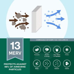 The Filterbuy replacement air filter 16x25x4 (actual measurements: 15.38″ x 24.38″ x 3.63″) ensures that your furnace, air conditioner, heat pump, or HVAC system is circulating the cleanest air possible to help preserve your budget and healthy lifestyle. MERV 13 synthetic media (comparable with Healthy Living Ultimate Allergen Defense MPR 1500 – 1900 & FPR 10) is recommended if you have a respiratory illness (such as asthma) due to its capability to trap 98% of airborne particles, protecting your home or business from bacteria, smoke, smog, debris, lint, pollen, mold, dander, and other forms of dust without impacting air flow. Our electrostatically charged design features 12 pleats per foot that increases surface area to capture more harmful particles and prolong the filter’s lifespan. Industrial-grade beverage board frames paired with dual wire backings outperform standard cardboard designs by improving structural integrity with their ability to endure heat up to 200° F while also withstanding exposure to moisture. Plus, installation is made simple with the addition of easy-to-understand arrows that help identify the direction of air flow and subsequently the way the filter needs to be placed. Filterbuy: Breathe Freely!