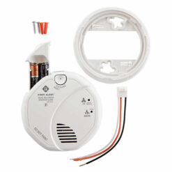 The First Alert BRK Hardwired Talking Photoelectric Smoke and Carbon Monoxide Alarm features a photoelectric smoke sensor and an electrochemical carbon monoxide sensor. The exclusive voice alarm not only alerts you whether the threat is smoke or carbon monoxide, but also tells you the location of the danger; you can pre-program up to 11 locations in your home. The 120-volt CO smoke detector is designed to be hardwired into your home or office and offers a battery backup for continued functionality in the event of a power outage. The one-touch silence/test button makes it easy to operate. Connect them to other compatible hardwired detectors as part of a system for larger spaces. This kit also includes universal adaptors for a quick and easy installation with most existing First Alert®, BRK®, Kidde®, and Firex® Alarms which would typically require them to be rewired.