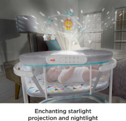 From soothing sways, music and sounds to calming vibrations, light projection and more, the Soothing Motions Bassinet has everything to help your baby drift off to dreamland in comfort. As little ones relax on the comfy sleeping pad, they can look up at the mesmerizing overhead mobile with stars while they gently sway. Or, turn on one of the captivating light features, like the overhead projection. You can also remove the projector from the bassinet and use it as a tabletop soother! And, there’s a convenient night light setting for an added sense of security. For extra coziness, activate the 30 minutes of calming vibrations and serene songs or sounds. Sweet dreams, baby! Use only with a child who is unable to push up on hands and knees, pull up or sit unassisted.