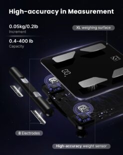 - [High Precision Measurements for Full Body] The Smart Body Fat Scale utilizes an eight-electrode technique for segmental BIA, comprehensively measuring five segments of your body (four limbs and torso) using double frequency. Equipped with eight high-precision sensors, this body weight scale accurately tracks weight with a 0.2 lb accuracy and supports weights up to 400 lbs. (FSA / HSA eligible).