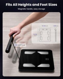 - [Convenient & Durable] The all-in-one display shows seven basic indicators at a glance. Featuring a minimalist design with a retractable handle for easy storage, it includes a 59-inch long line suitable for users of all heights. The scale’s black 6mm tempered glass and ABS black bottom shell ensure durability and stability. The FITINDEX smart scale for body weight is the perfect combination of convenience and durability (Tips: Gravity startup 11-15 lb).