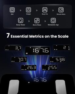 - [50 Body Composition Analyzer] Smart fit scale shows not only weight but also BMI, body fat, muscle mass, fat-free body weight, subcutaneous fat, visceral fat, body water, protein, skeletal muscle, BMR, bone mass, protein and metabolic age by electrical Bio-Impedance Measurement Technology. Meanwhile, weight scale with body fat and muscle also has 5-segment muscle and fat analysis and multiple site circumference data.
