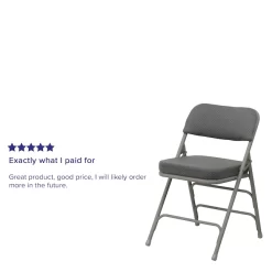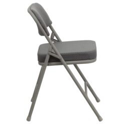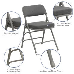 Ensure that your guests, clients or parishioners pay more attention to you than the clock with these ultra-comfortable folding chairs. Folding chairs are a practical choice for social activities and everyday use in the home due to their compact storage capabilities. These metal folding chairs are commercial grade to withstand heavy and daily usage in any industry. Take your regular group meetings outdoors instead of staying in a stuffy room or host beautiful outdoor events with the arrangement of these padded folding chairs. While suitable for outdoor use store indoors to protect the frame from extreme moisture. Its 18-gauge triple braced curved steel frame supports up to 300 pounds while the non-marring floor glides protect your flooring from scuffs and scrapes. The uses are endless with multi-purpose chairs to fulfill your seating needs for your business or home. With nothing to assemble these chairs come ready to service your needs.